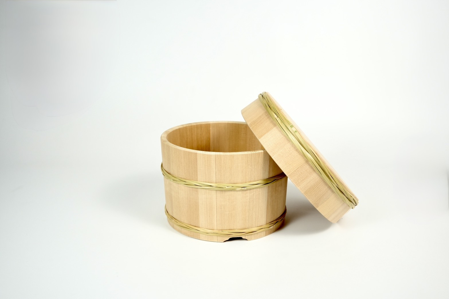 さらに、さわらの美しい木目にもご注目ください。より緻密に年輪の詰まった「柾目材(まさめざい)」が贅沢に使用されており、まっすぐで美しい見た目はもちろん、反りや収縮が少なく、お櫃としての丈夫さにも一役買っています。