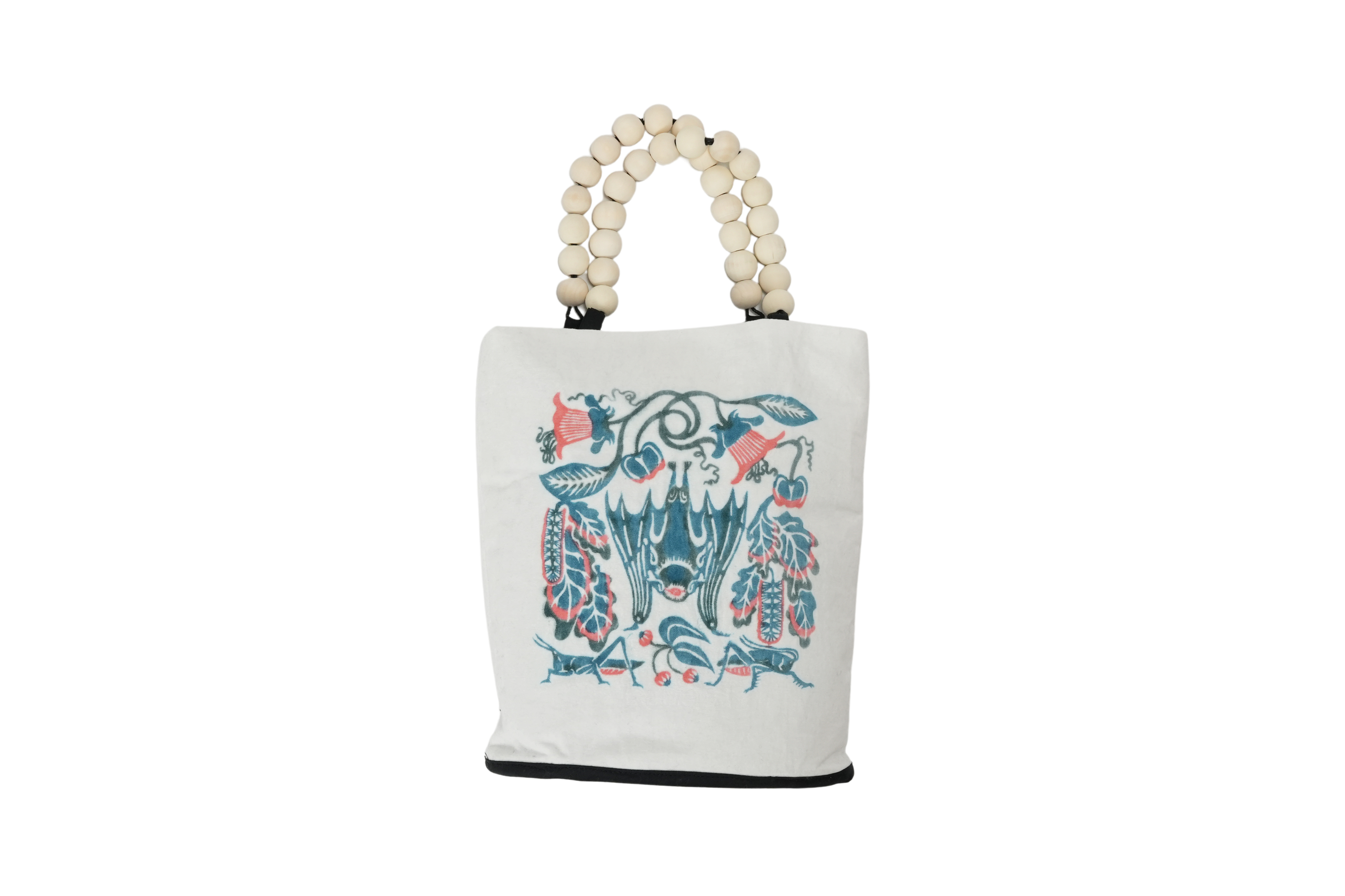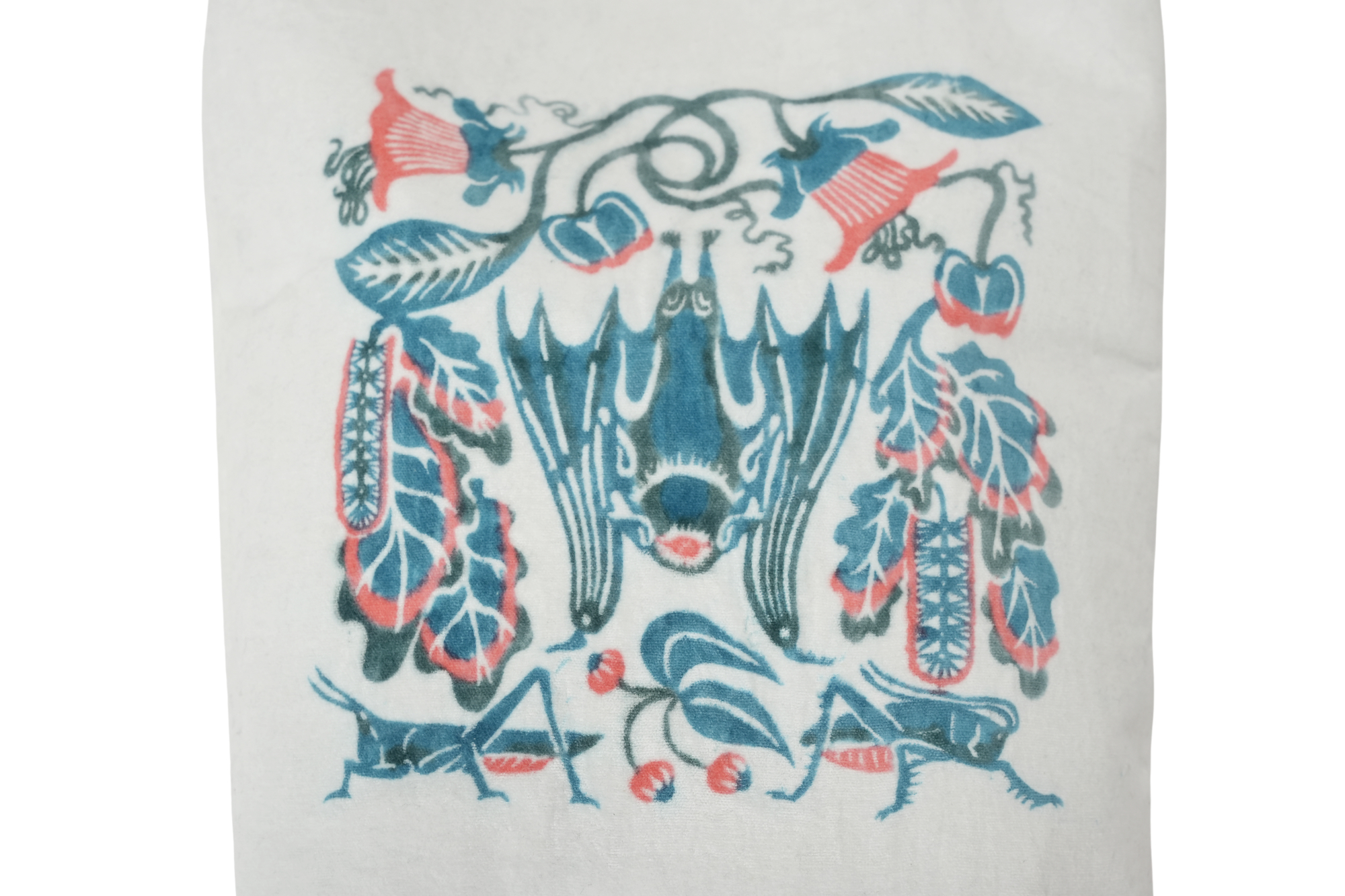 ふわふわとした別珍生地の中心に描かれているのは、一匹のコウモリ。その下には、対をなすように配された花々と、種類の異なるバッタ。