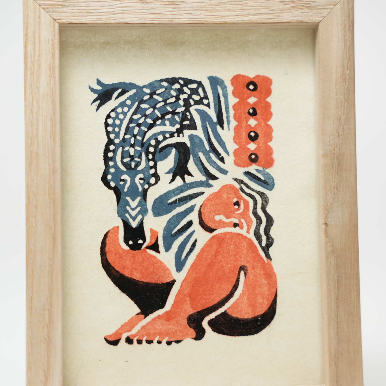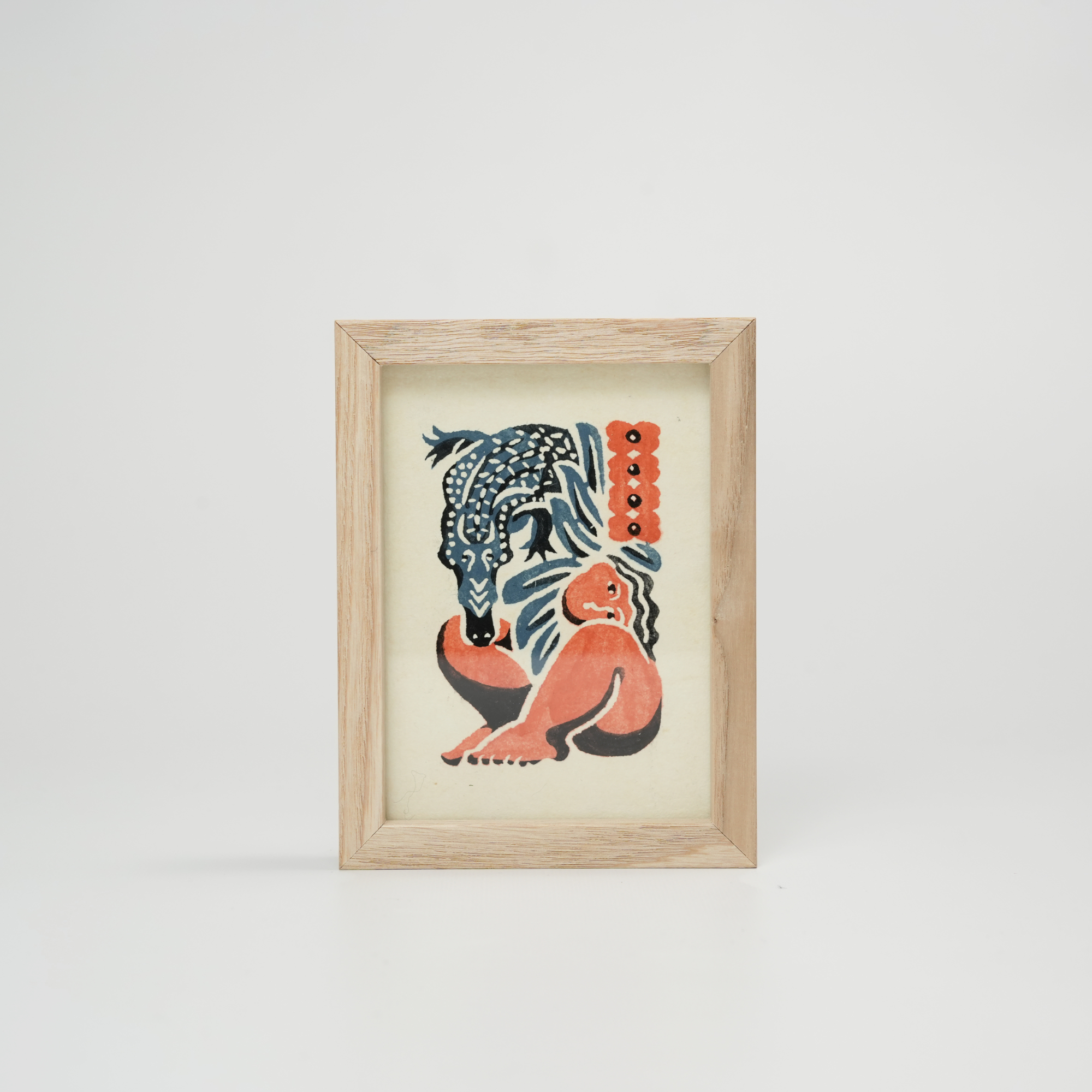 そんな、哲学的でどこか切なさを孕んだタイトルが、観る者の想像力を強く刺激します。型染め特有の力強い輪郭と、繊細な色の重なりが生み出す独特の質感が、静かな画面の中に奥行きを与えています。