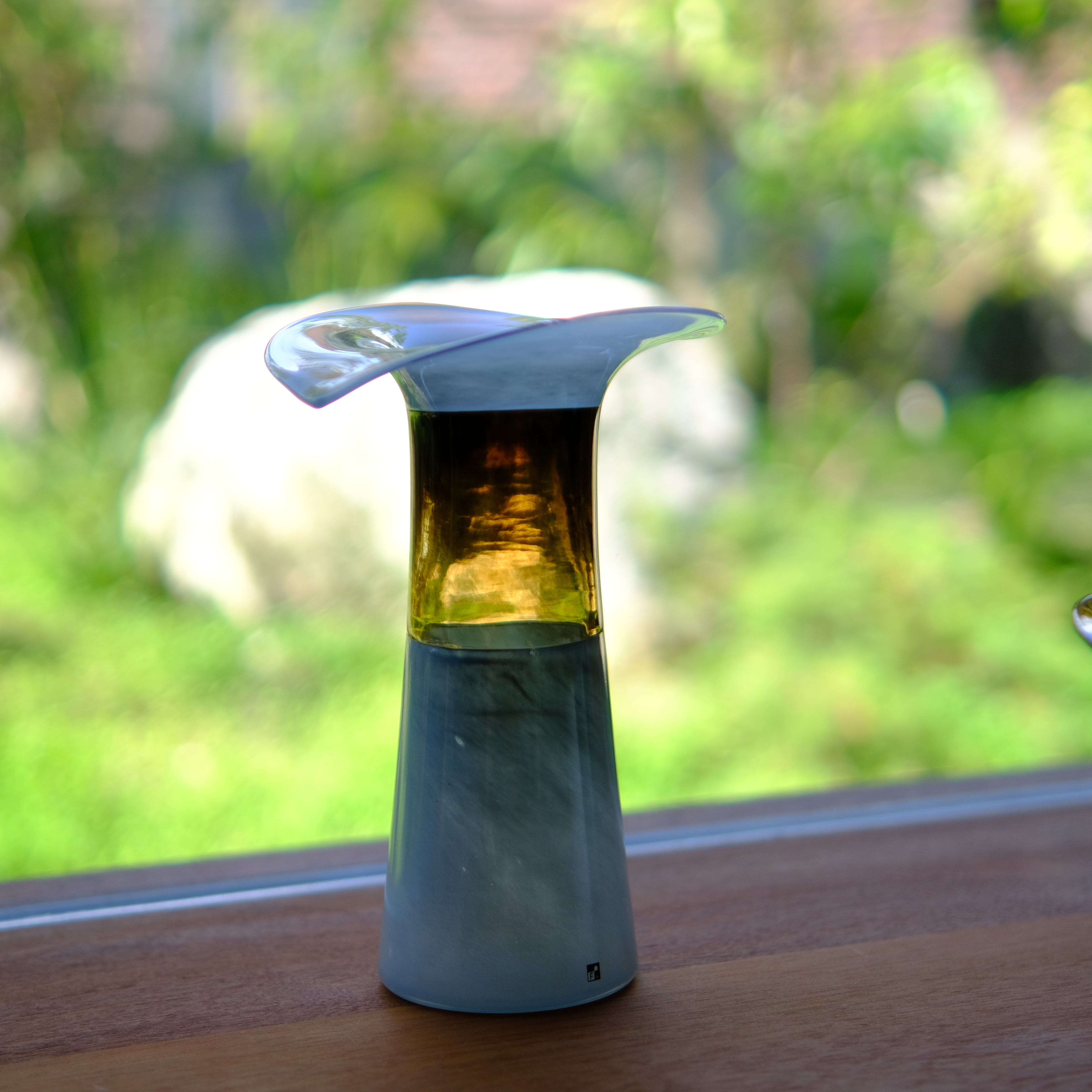 グレーのような、水色のような、不透明なガラスと、茶色のような、黄色のような、少し透けたガラス。