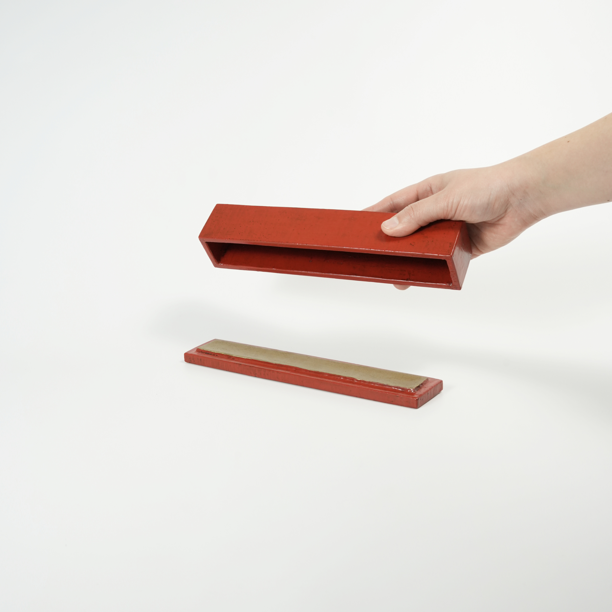 この長方箱は、松崎さんが古の陶磁器が持つ端正な姿に惹かれ、その造形を木と漆で写し取ったものです。