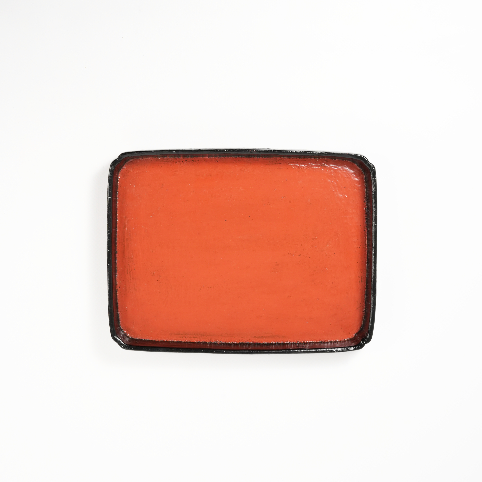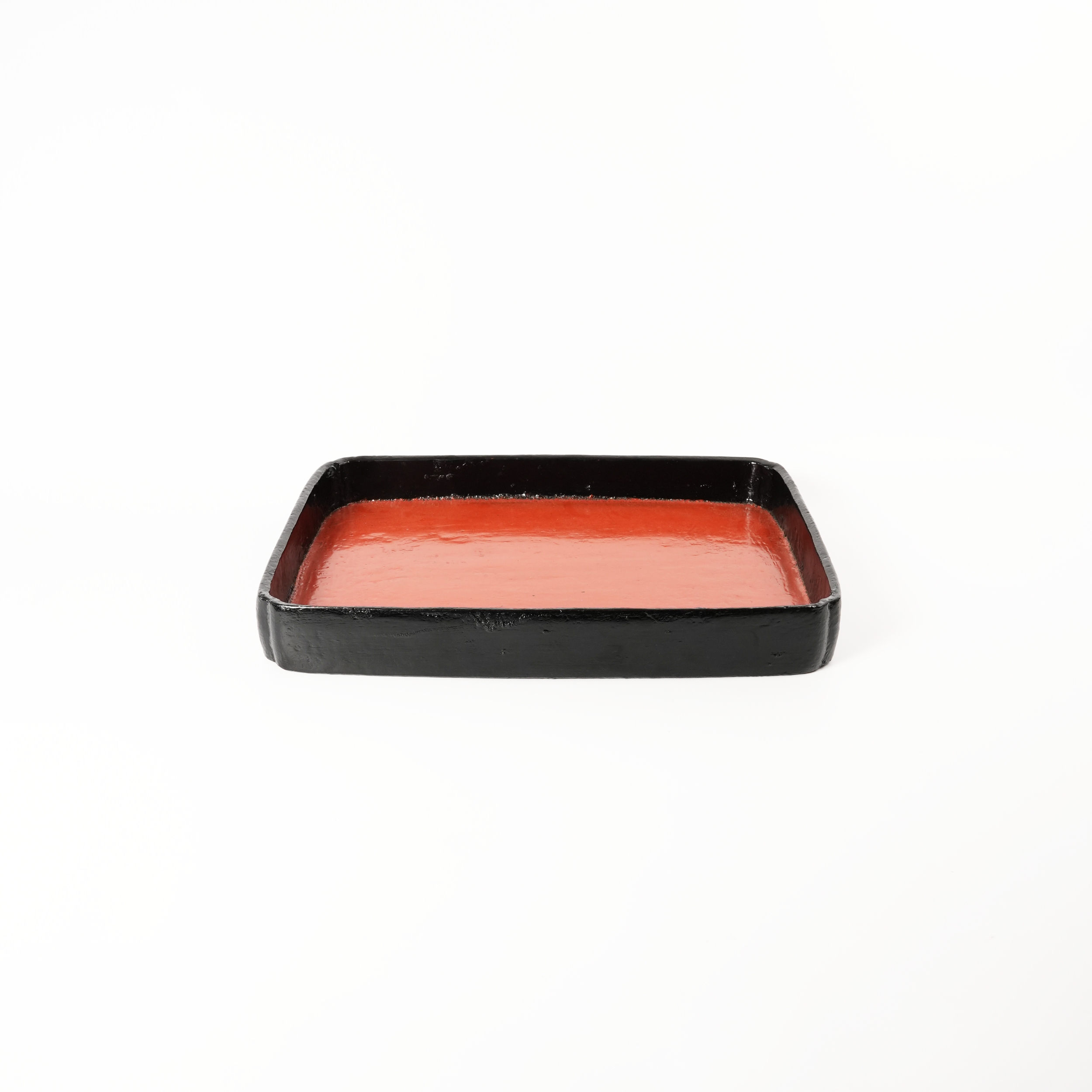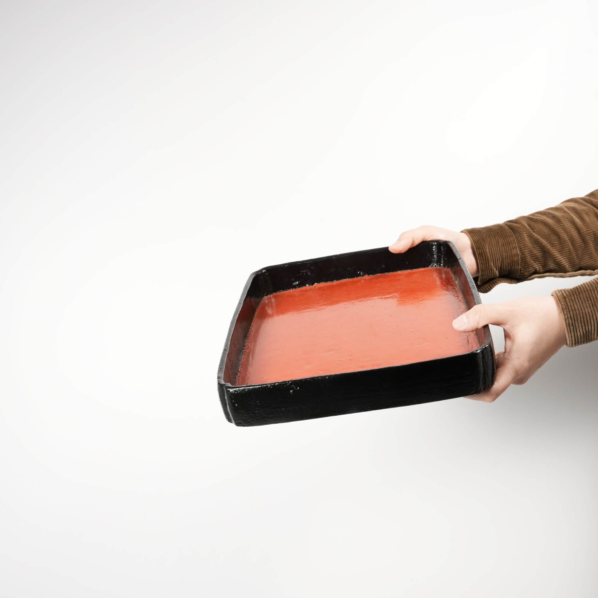 This deep tray possesses a dignified presence, highlighted by the striking contrast between black and vermilion lacquer. The four corners are rounded and carved by hand, featuring a soft, organic design that tells the story of its origin—born from a single block of wood.